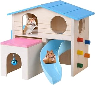 Ponacat ハムスターハウス おもちゃ 2階 建て お家 飼育ケージ 別荘 遊び場 二層 木造住宅 滑り台 組み立て簡単 運動不足解消 小さな動物 小動物 ペット用品 ブルー